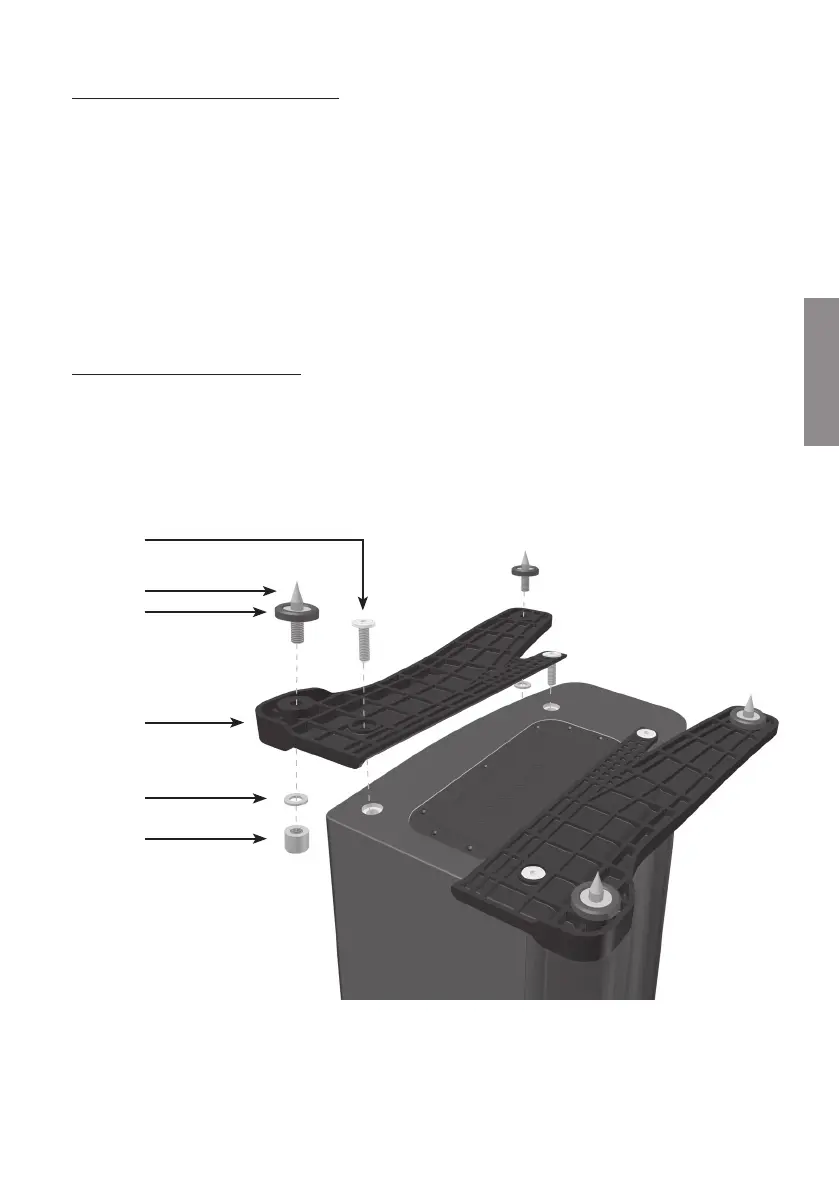 Installare i basamenti e i piedini a punta sulla base di ogni altoparlante (cfr. pagina 32).
