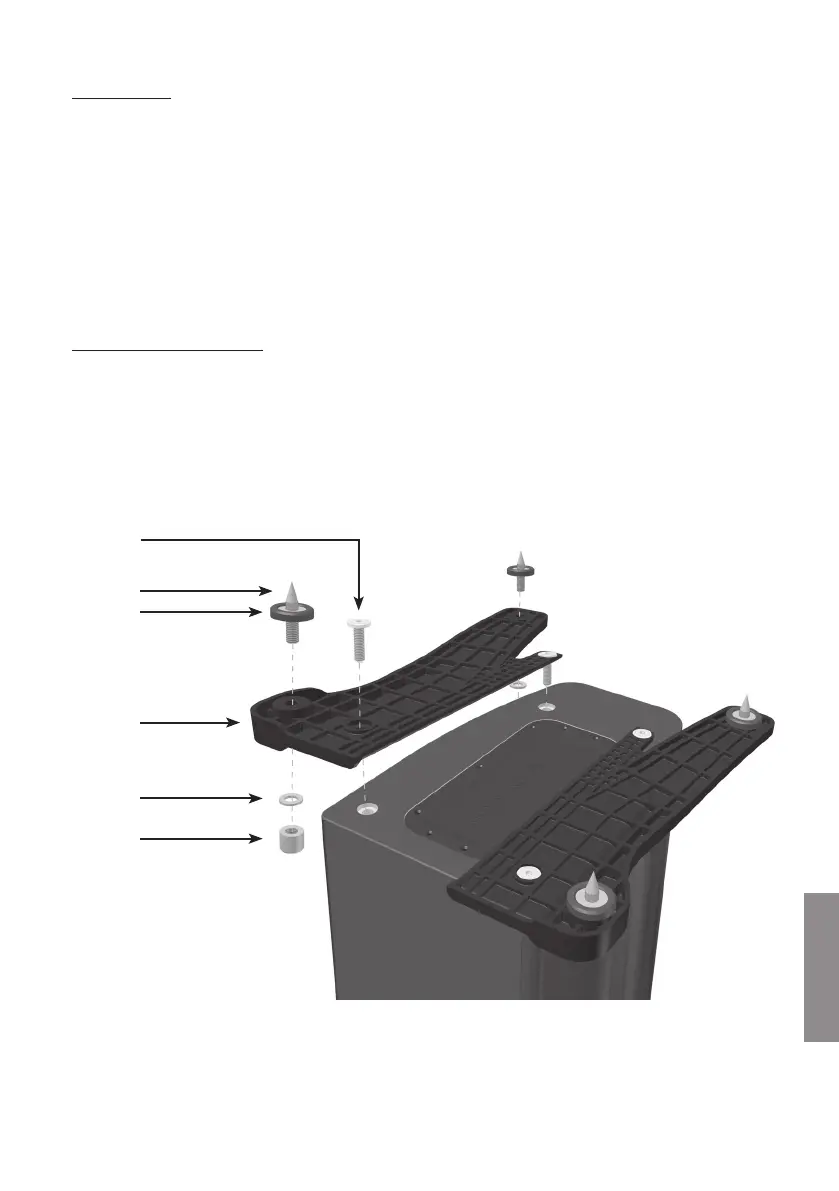 Breng de plinten en puntvoetjes aan op het voetstuk van elke luidspreker. Zie pagina 88.