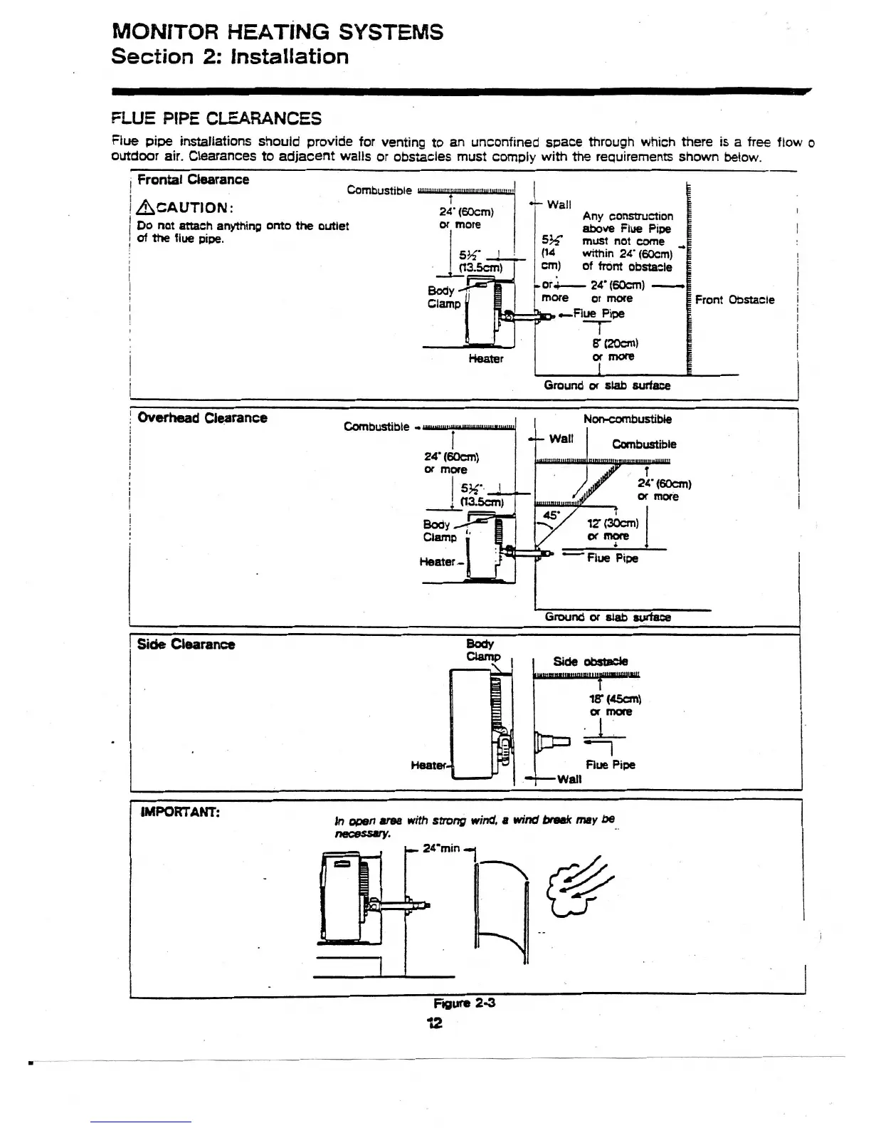 Monitor 422 - Flue Pipe Clearances; Frontal Clearance; Overhead Clearance; Side Clearance