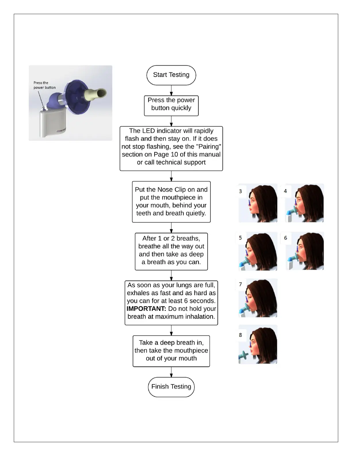 Monitored Therapeutics GoSpiro Spirometer - Quick Start Testing: Initiate; Quick Start Testing: Power On; Quick Start Testing: LED Feedback; Quick Start Testing: Apply Nose Clip;Mouthpiece