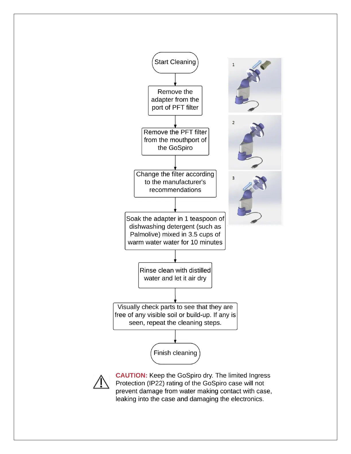 Monitored Therapeutics GoSpiro Spirometer - Quick Start Cleaning: Initiate; Quick Start Cleaning: Remove Adapter; Quick Start Cleaning: Remove Filter; Quick Start Cleaning: Filter Replacement