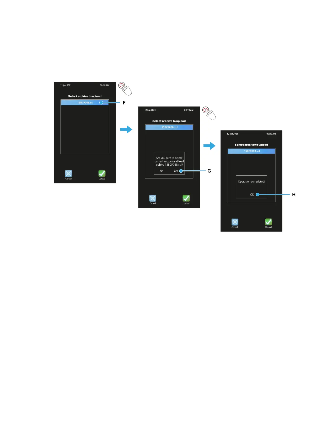 9. Touch the recipe archive required (F), and then touch the Upload () button.