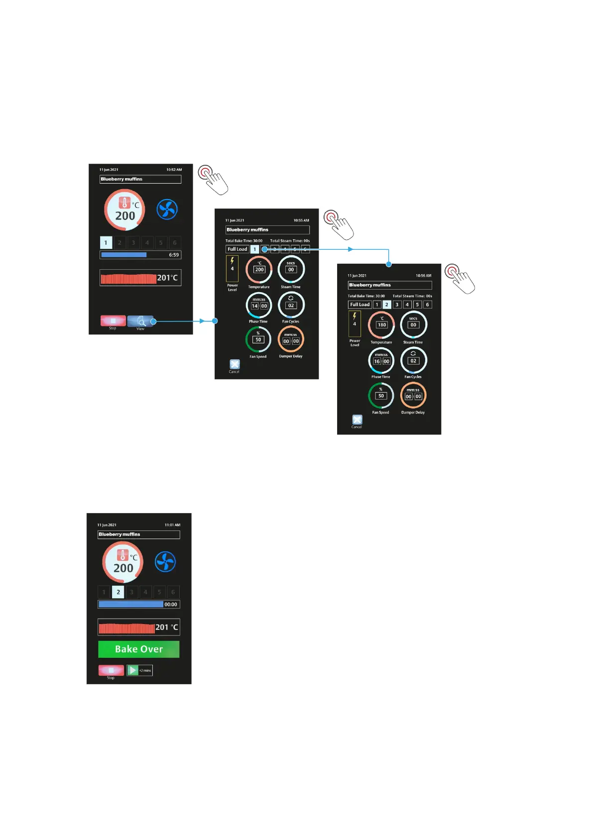 − Touch the numbered square (e.g., 2) to view the settings for different baking phases.