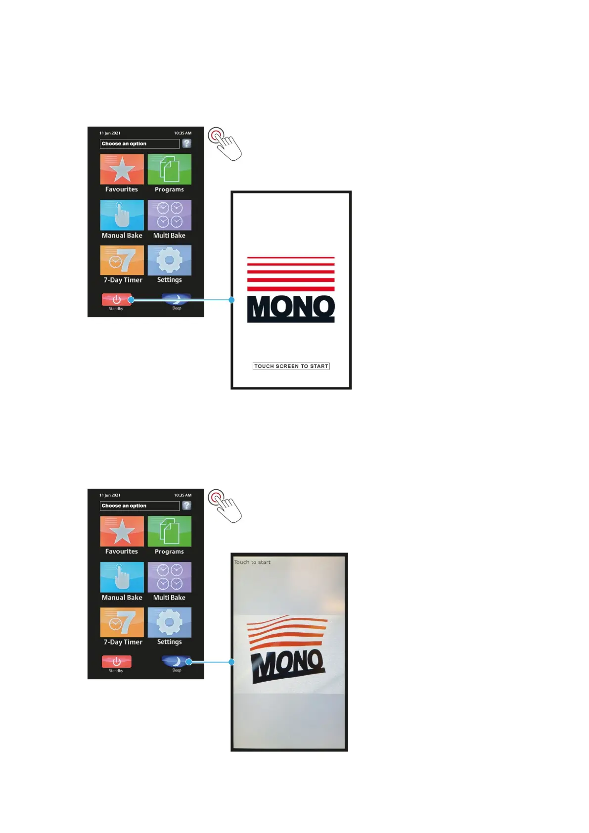 The Standby button turns the oven off until the screen is touched again.