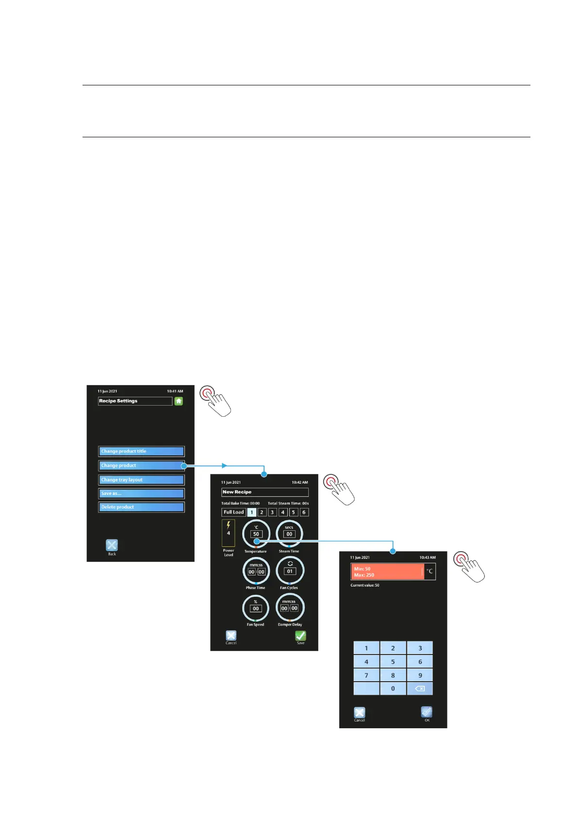 (g) If required, select the next baking phase (i.e. touch 2) and adjust the items in the same way.