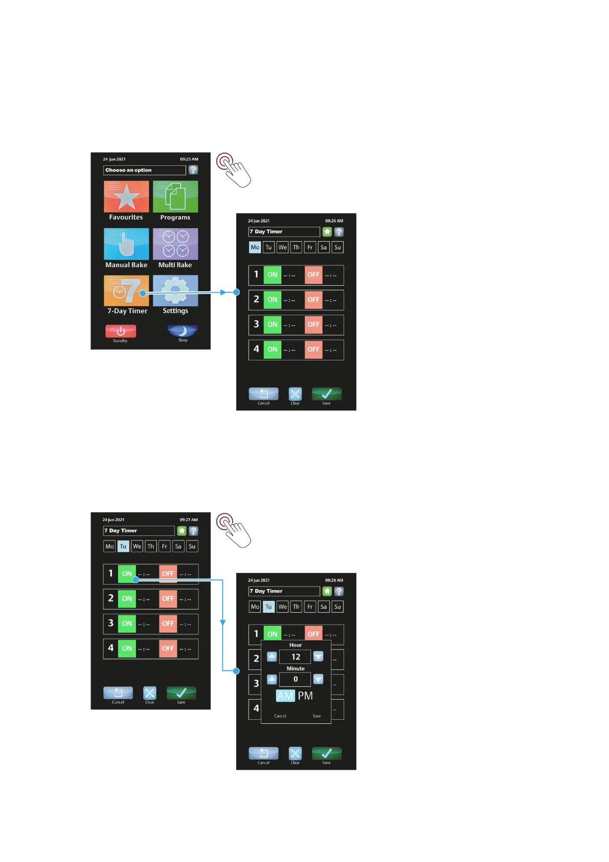 (b) Set the time using the keys in the pop-up box that appears, and then touch Save (A).