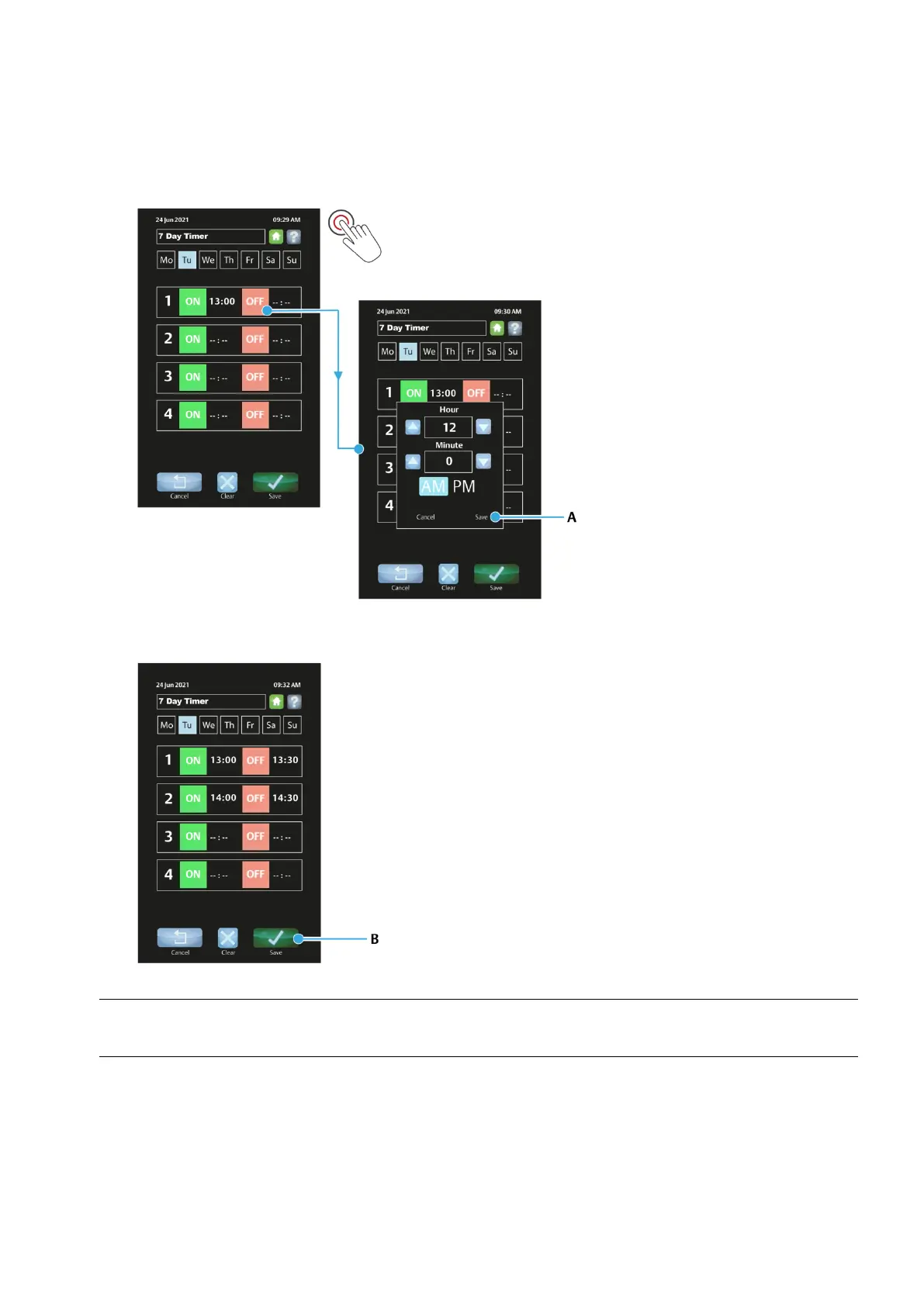 5. Touch Save (B) to confirm the 7-day timer settings.