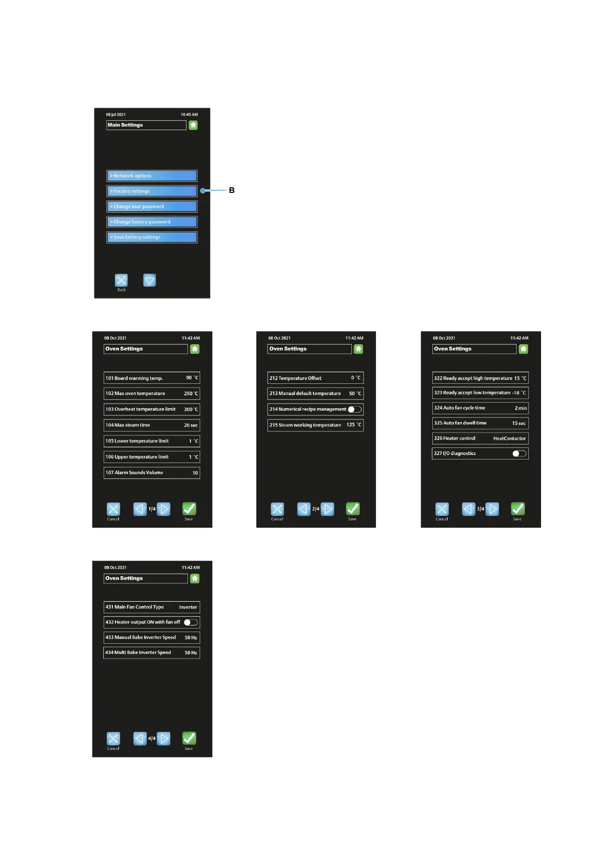 6. Touch the Left Arrow and Right Arrow buttons to access the pages of oven settings.