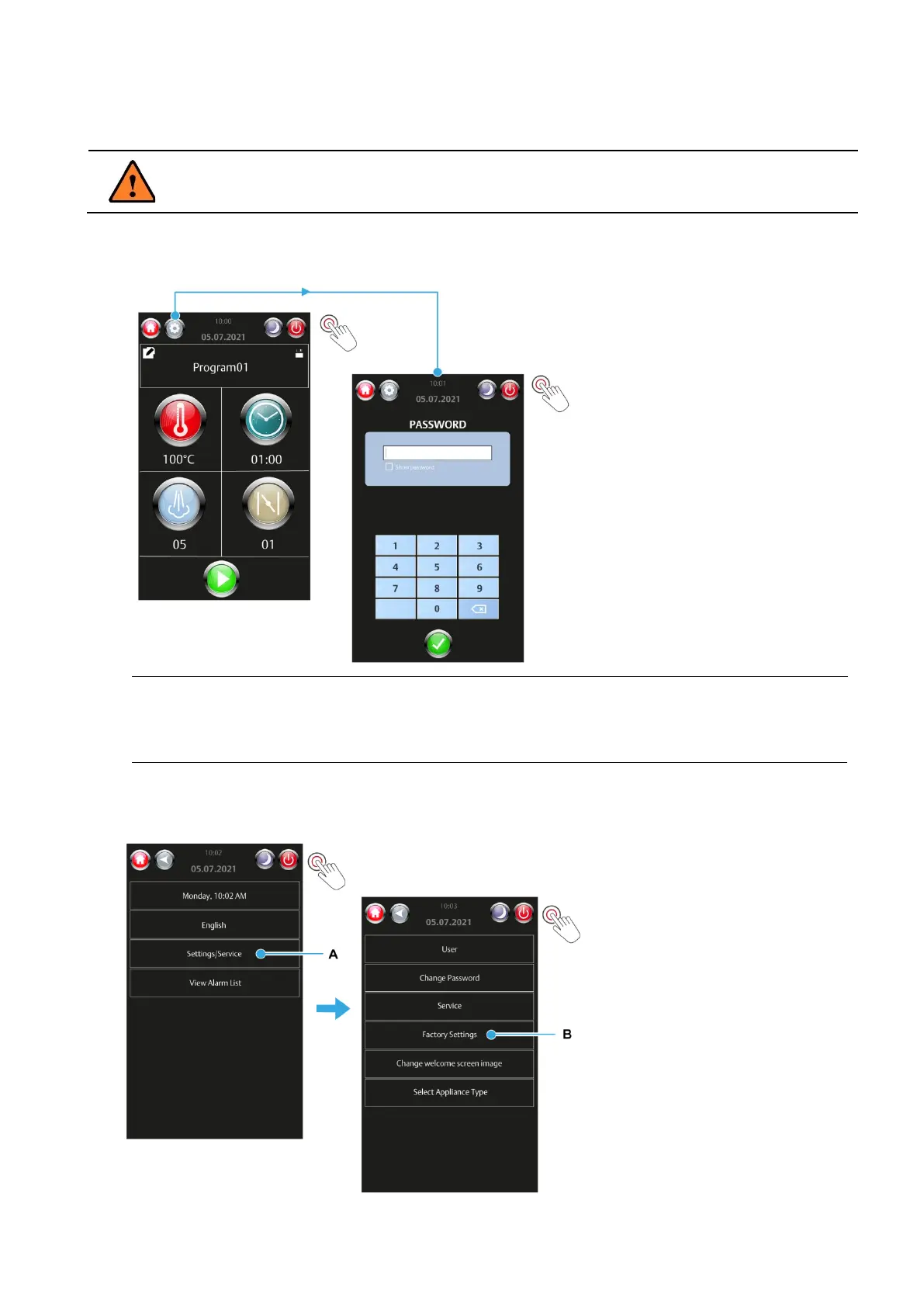4. Touch the Factory Settings panel (B).