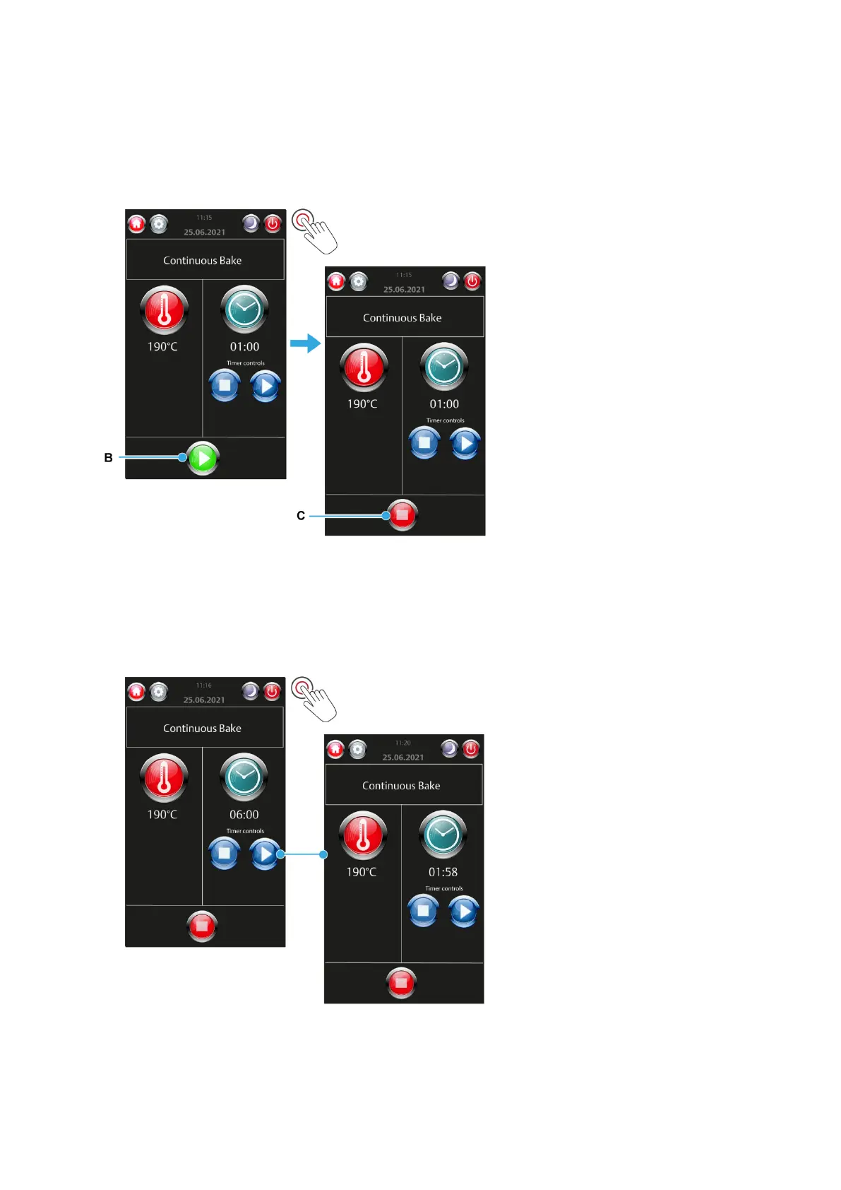 If the Stop button (C) is touched now, the oven maintains temperature and the fan does not reverse.