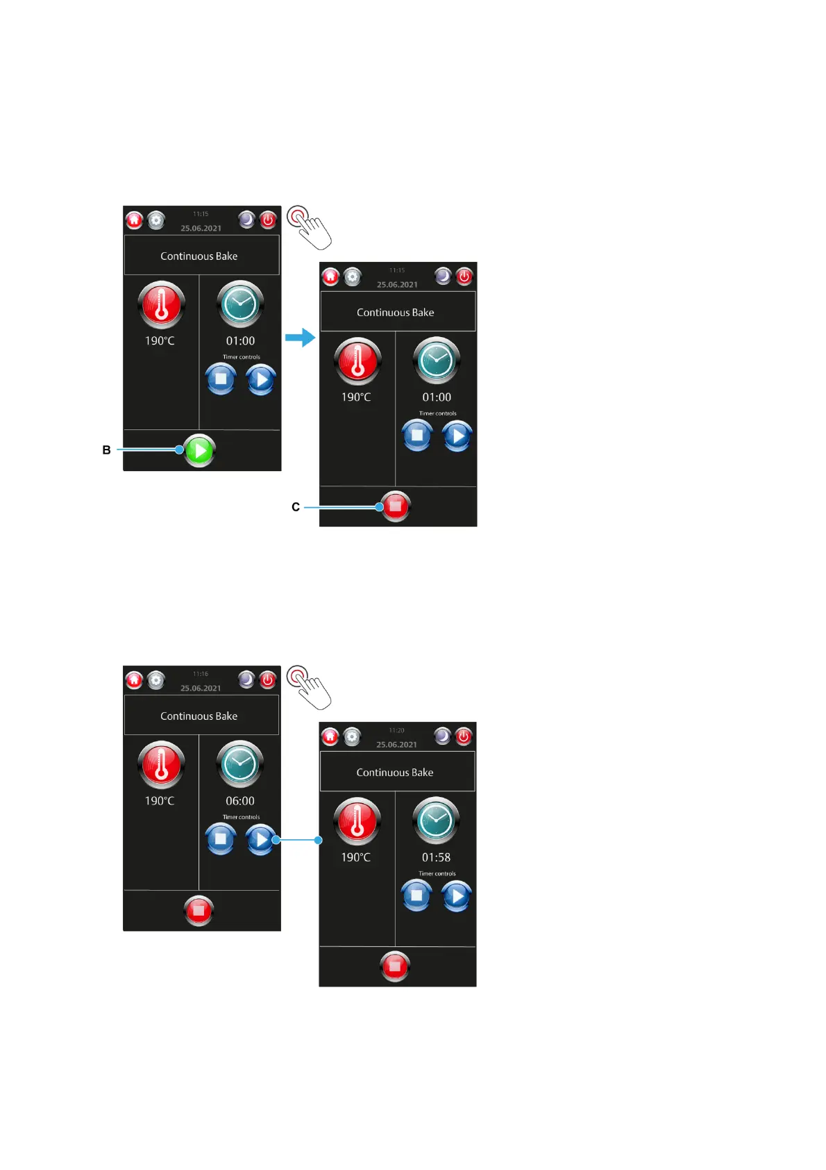 If the Stop button (C) is touched now, the oven maintains temperature and the fan does not reverse.