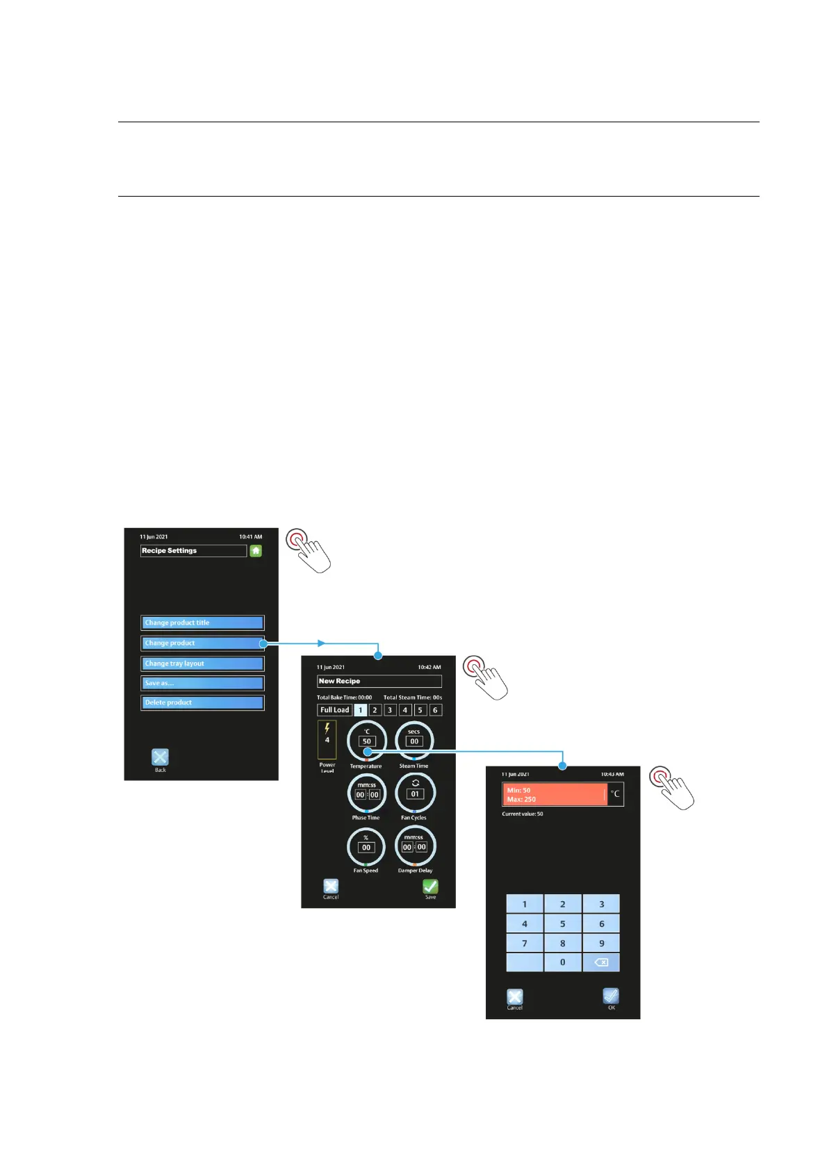 (g) If required, select the next baking phase (i.e. touch 2) and adjust the items in the same way.