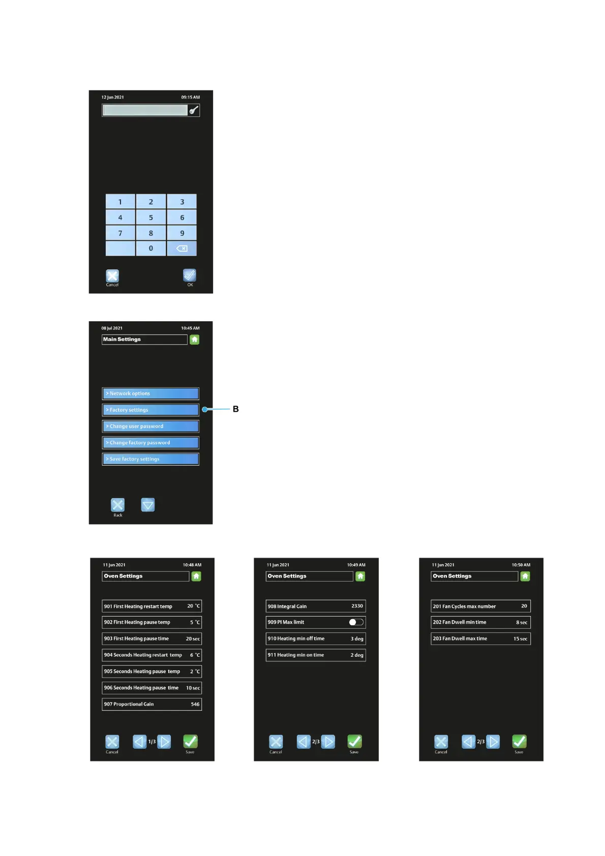 6. Touch the Left Arrow and Right Arrow buttons to access the pages of oven settings.