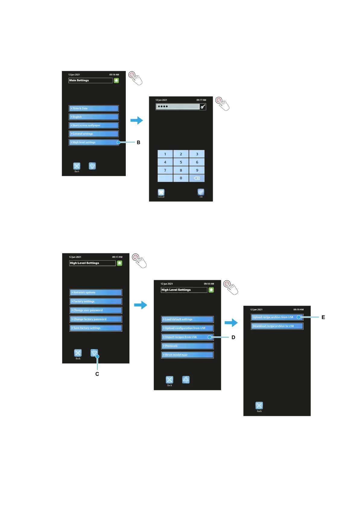 6. Touch the Down Arrow button (C) to display the next page of high-level settings.