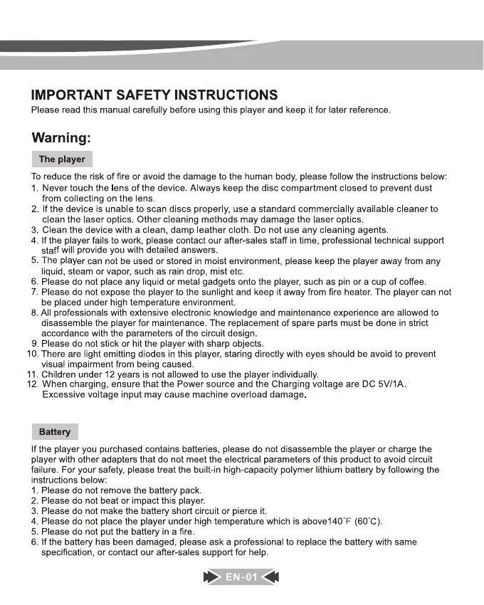 MONODEAL MD-602 - Important Safety Instructions; Player Safety Precautions; Battery Safety Guidelines