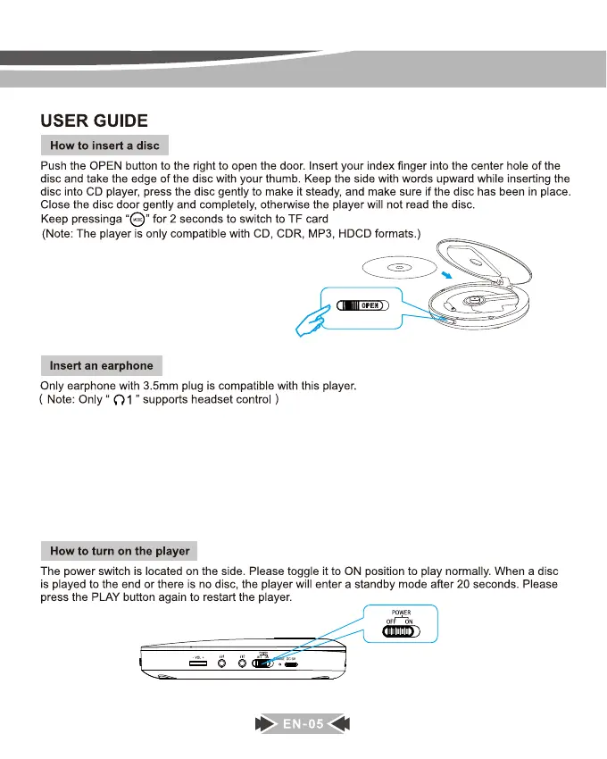 MONODEAL MD-602 - User Guide: Basic Operations; How to Insert a Disc; Connecting Earphones; Turning the Player On