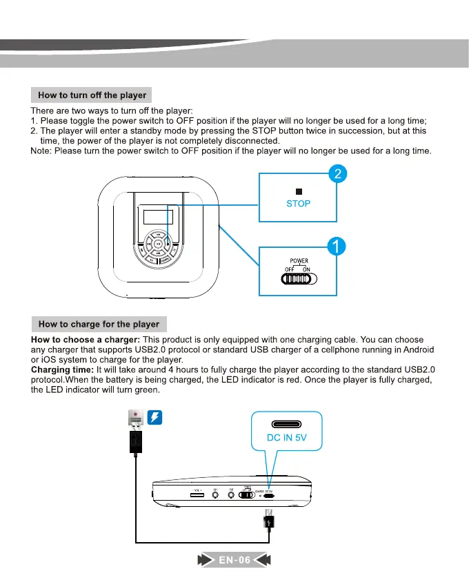 MONODEAL MD-602 - Turning Off the Player; Charging the Player