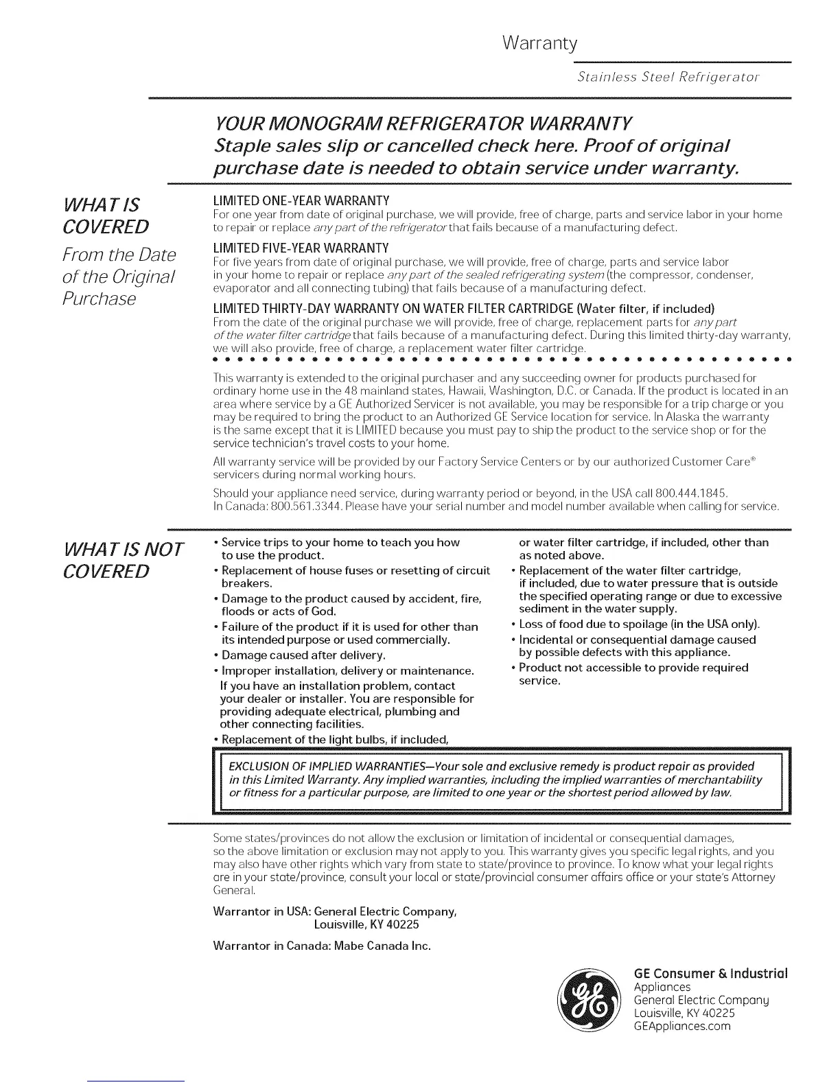 YOUR MONOGRAM REFRIGERATOR WARRANTY