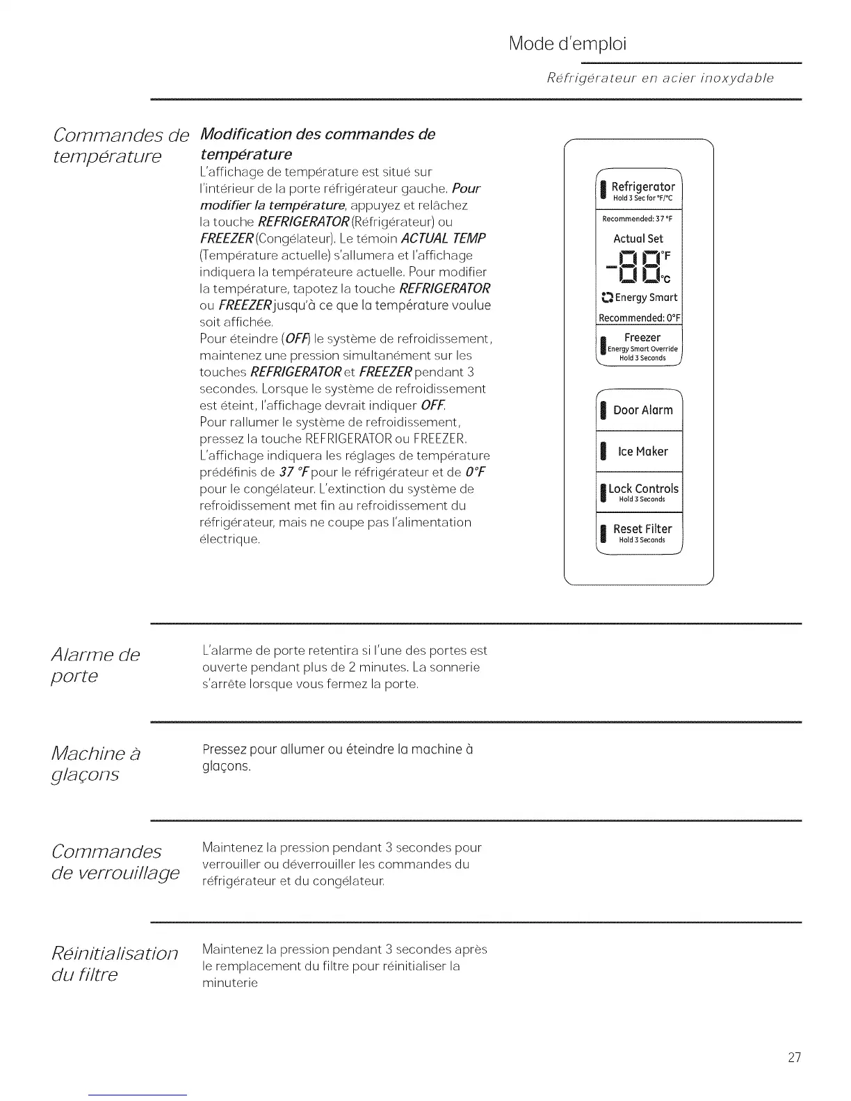 predefinis de 37 °Fpour le refrigerateur et de O°F