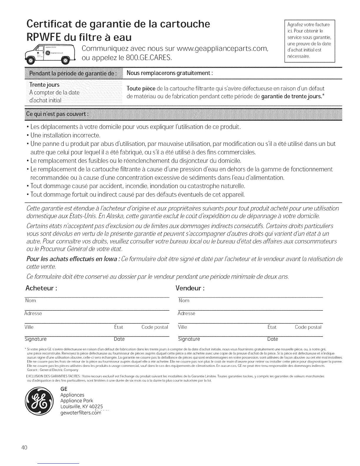 * Si votre piece GE s'avere detectueuse en raison d'un defaut de fabrication dans ]es trente]ours a compter de la date d'achat initiaJe, nous vous tournirons gratuitement une nouve]]e piece, ou, a notre gre,