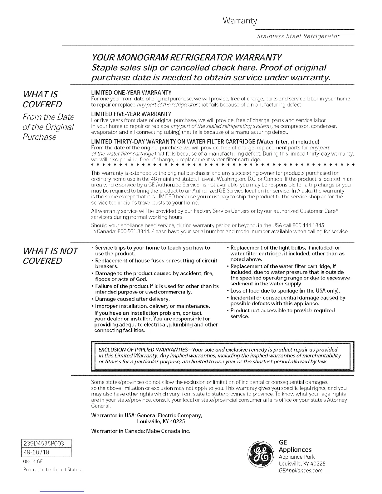 YOUR MONOGRAM REFRIGERATOR WARRANTY