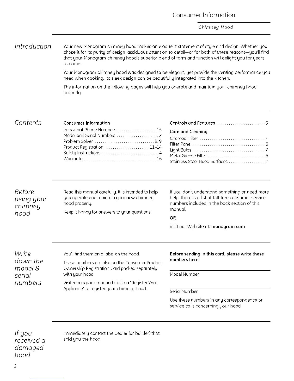 The information on the following pages will help 9ou operate and maintain gour chimney hood