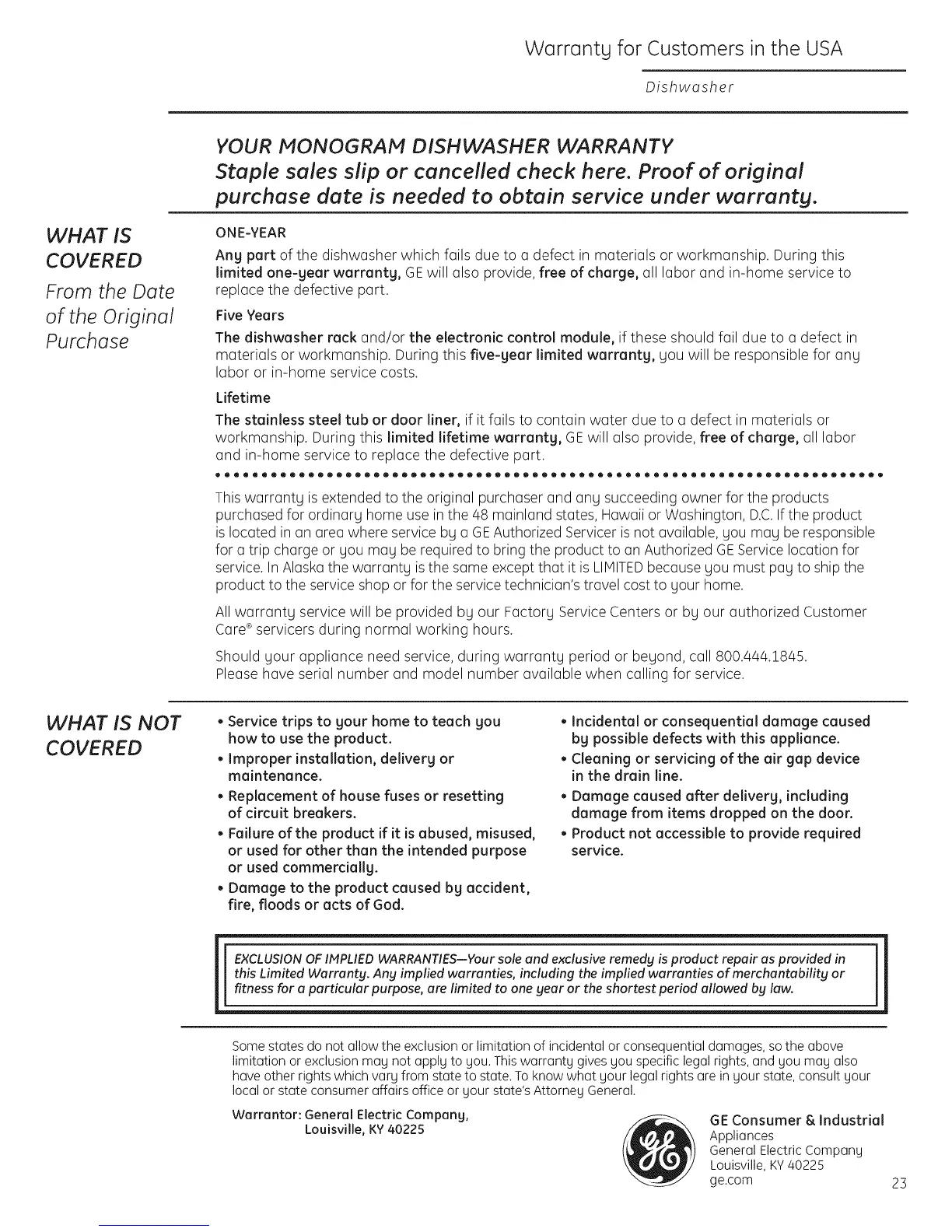 YOUR MONOGRAM DISHWASHER WARRANTY