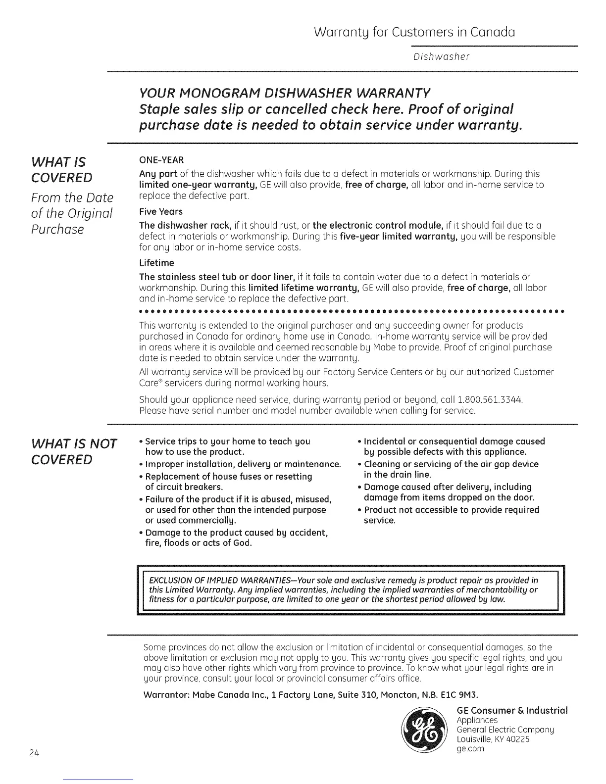 YOUR MONOGRAM DISHWASHER WARRANTY