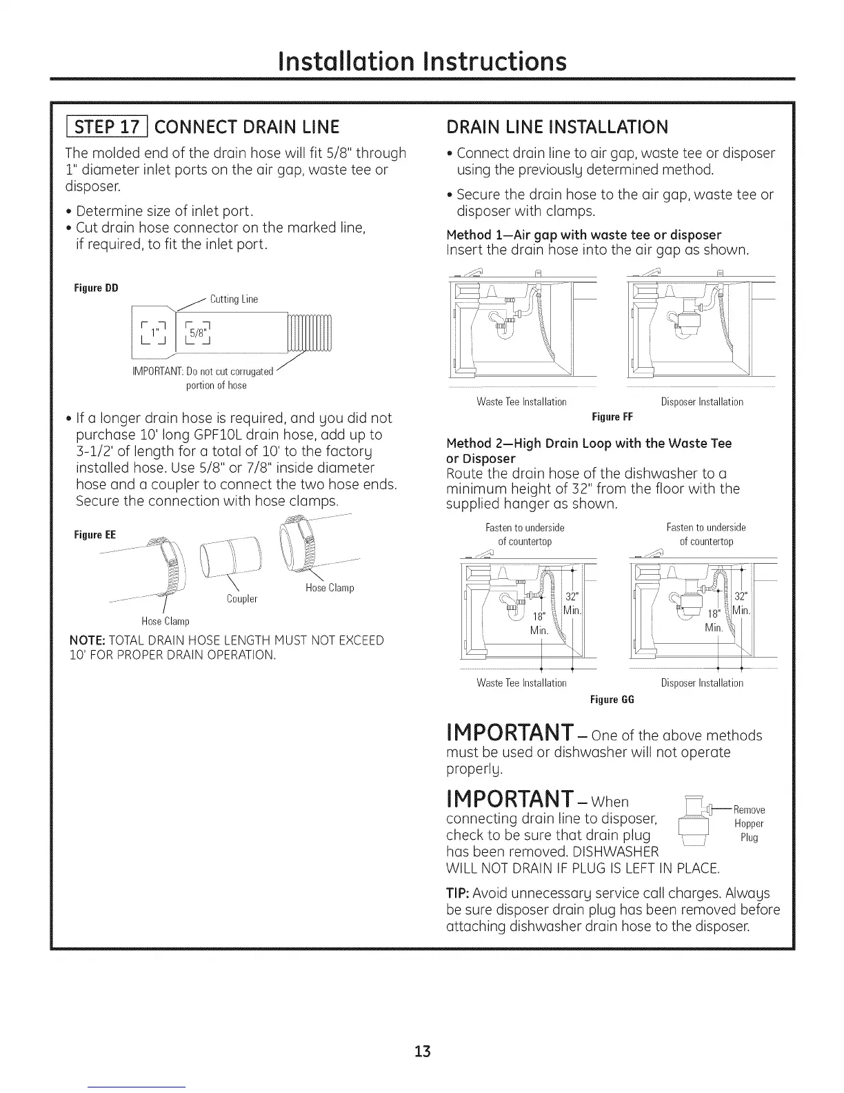 NOTE: TOTAL DRAIN HOSE LENGTH MUST NOT EXCEED