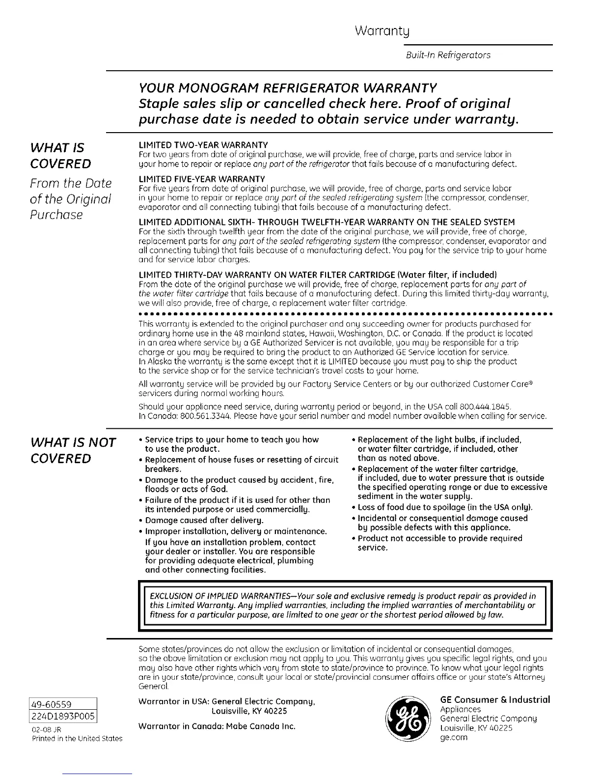 YOUR MONOGRAM REFRIGERATOR WARRANTY