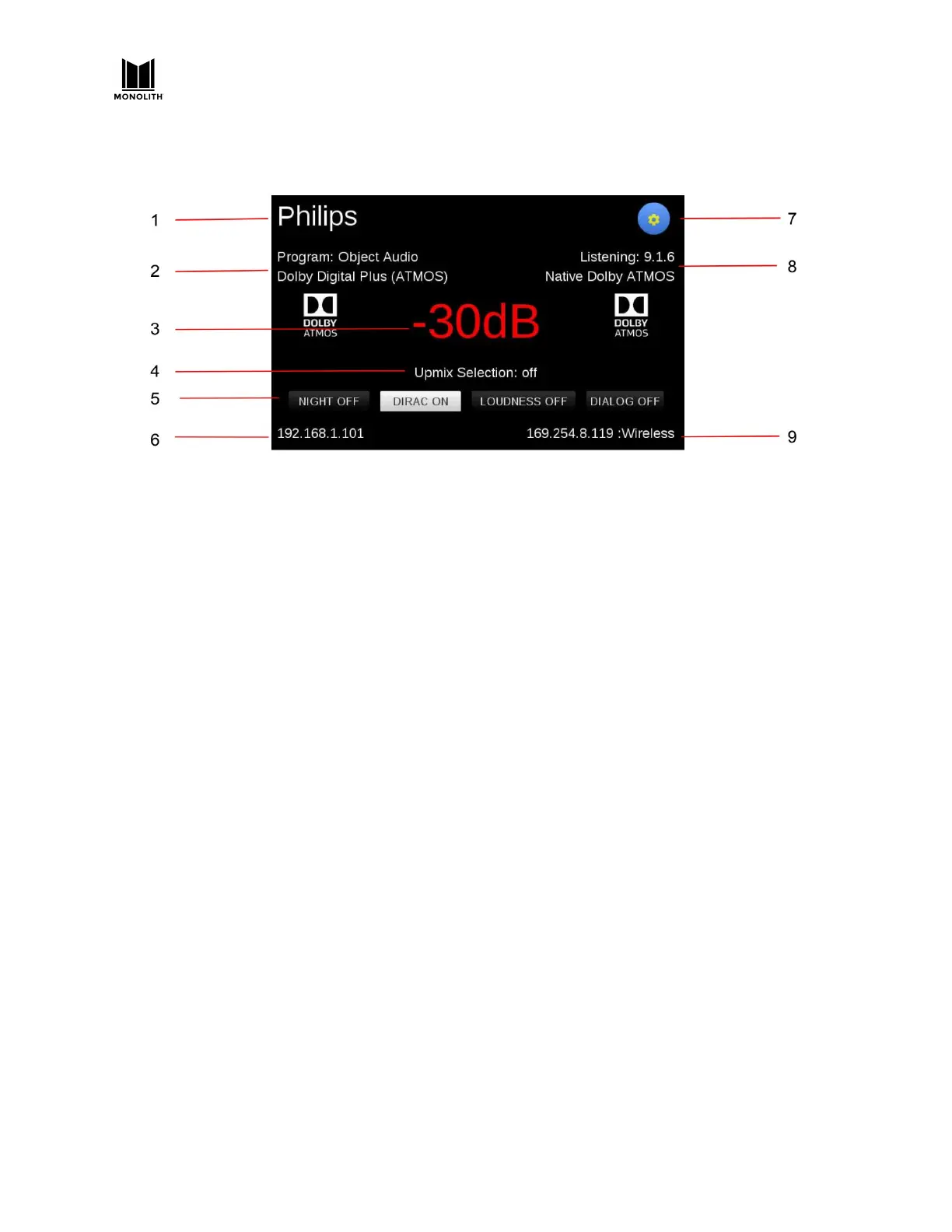 5. Special Listening Modes: The status of the NIGHT, DIRAC, LOUDNESS, and DIALOG modes is