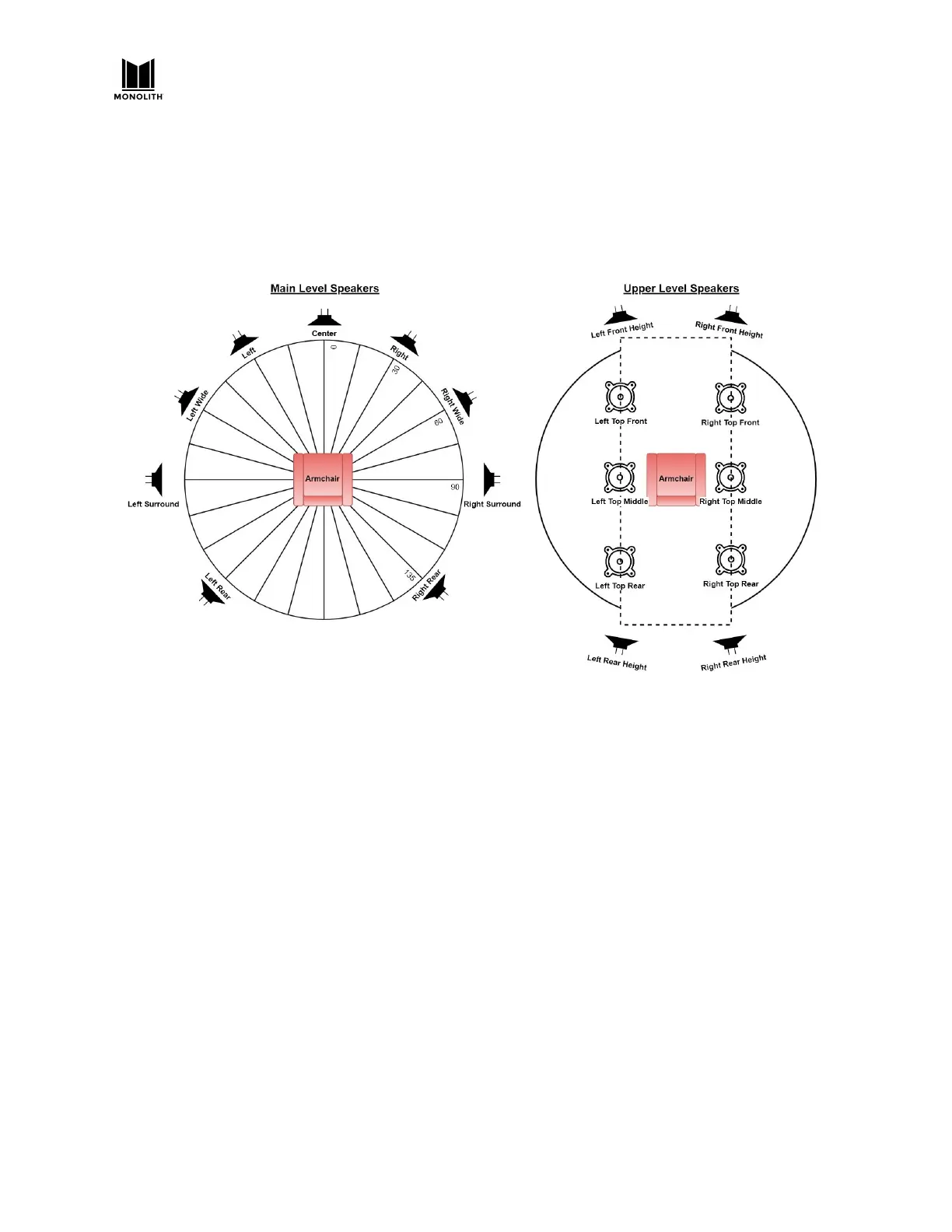 These two diagrams illustrate the ideal placement of main level and upper level speakers. Real world