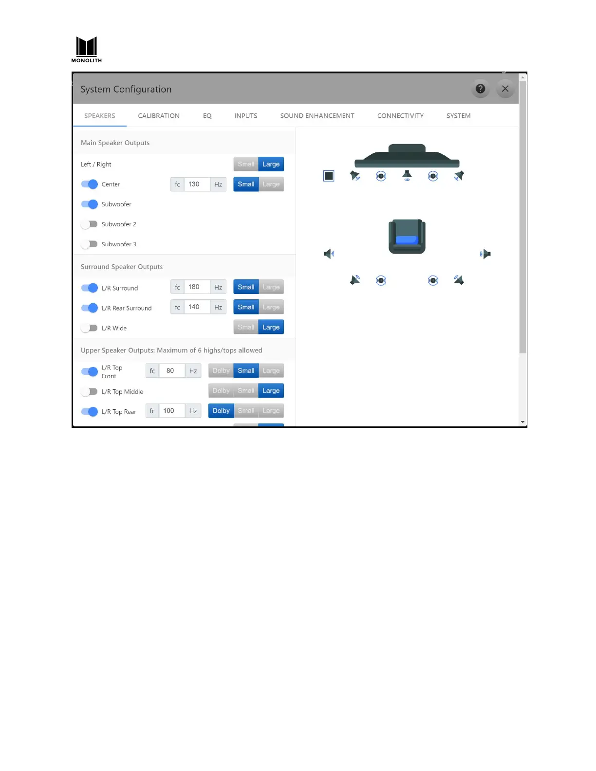 frequency for bass management. Blue indicates which option is chosen--“Large”, “Small” or “Dolby.” The
