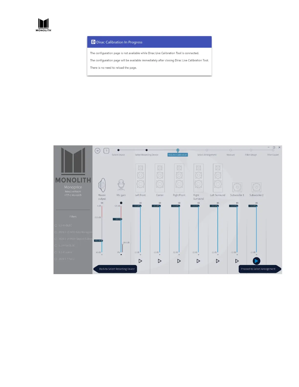 7) Set the volumes for calibration. The volume control on the left side of the Dirac screen exactly