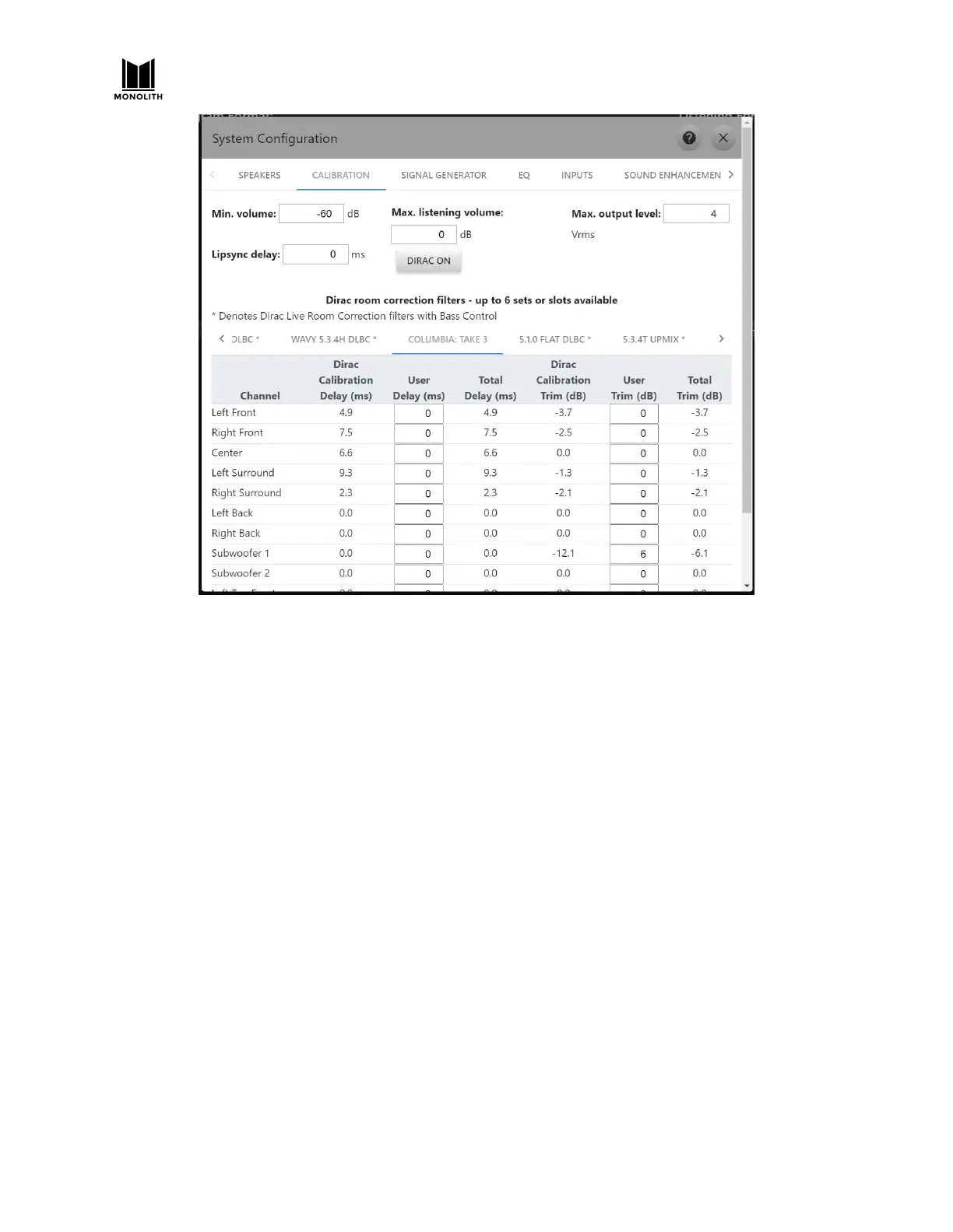 You can modify the Dirac calibration values with user values. You can also supply User Delay and User