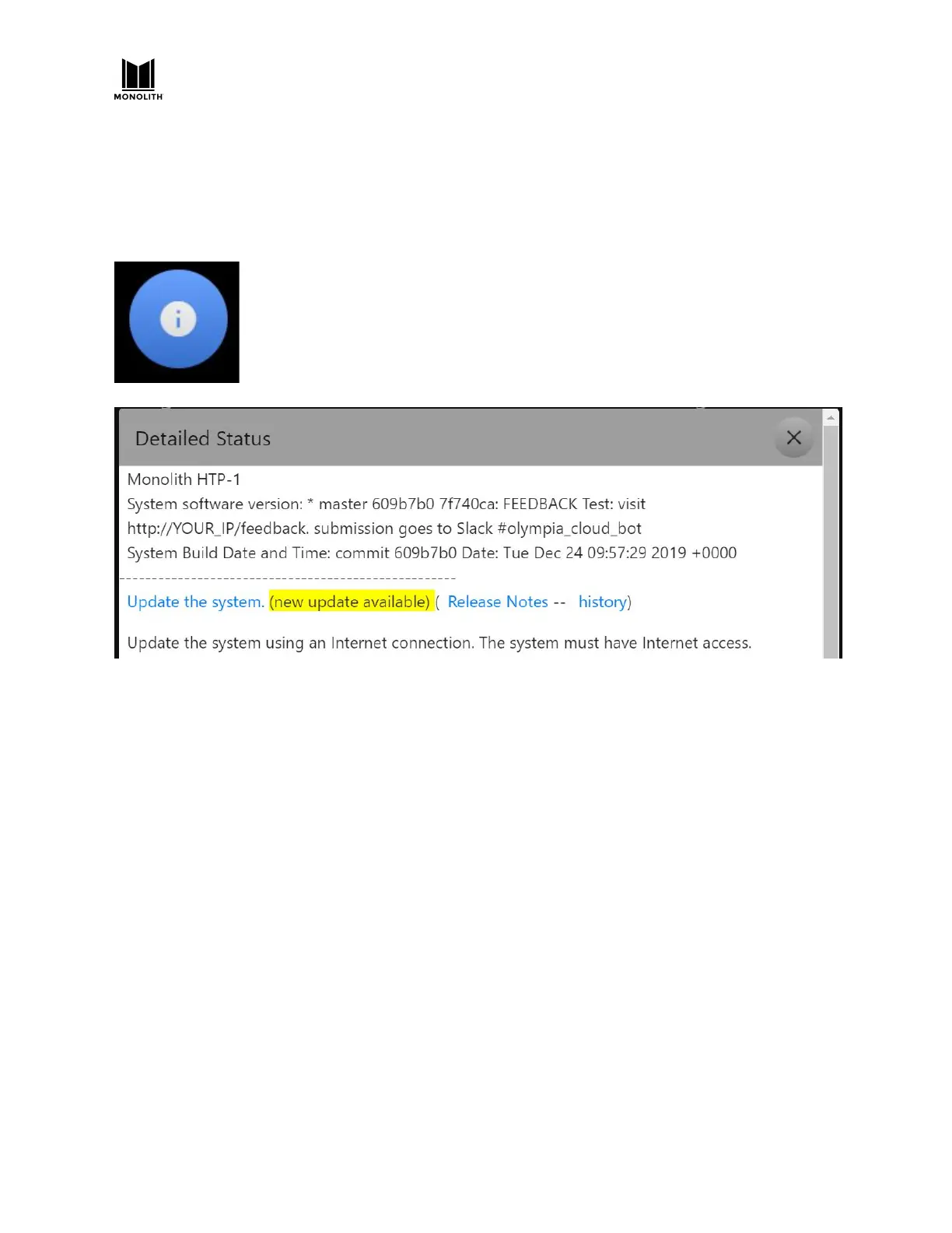 The Monolith HTP-1 software may see periodic improvements and it is easy to install an update from the