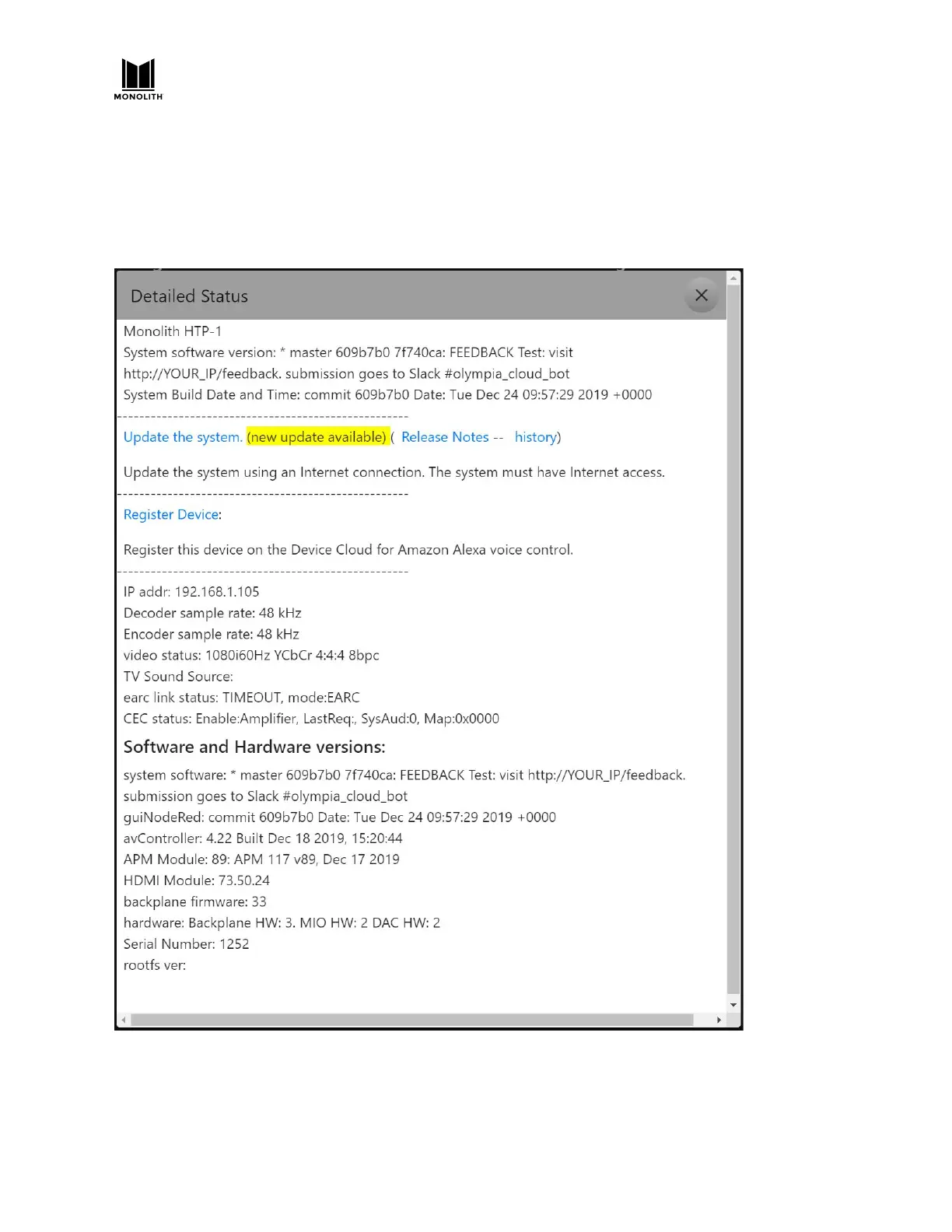 The Detailed Status page provides a link to register your Alexa device with the Amazon Device Cloud.