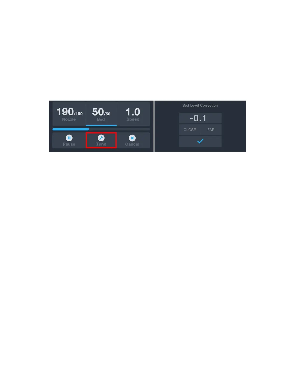 nozzle and the bed. Touch the Tune button to enter the Bed Level Correction menu, then