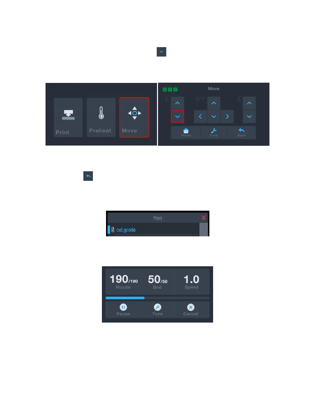 display the contents of the microSD™ card. Touch the cat.gcode entry to begin