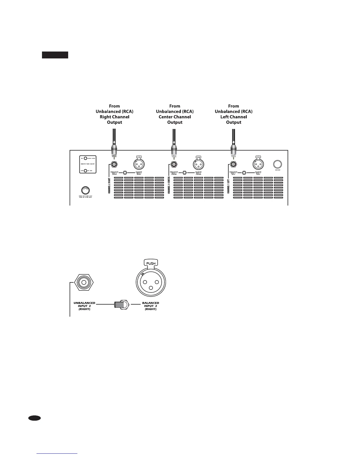 1. Connect one end of the unbalanced RCA type interconnects to the preamp outputs of your receiver/preamp.