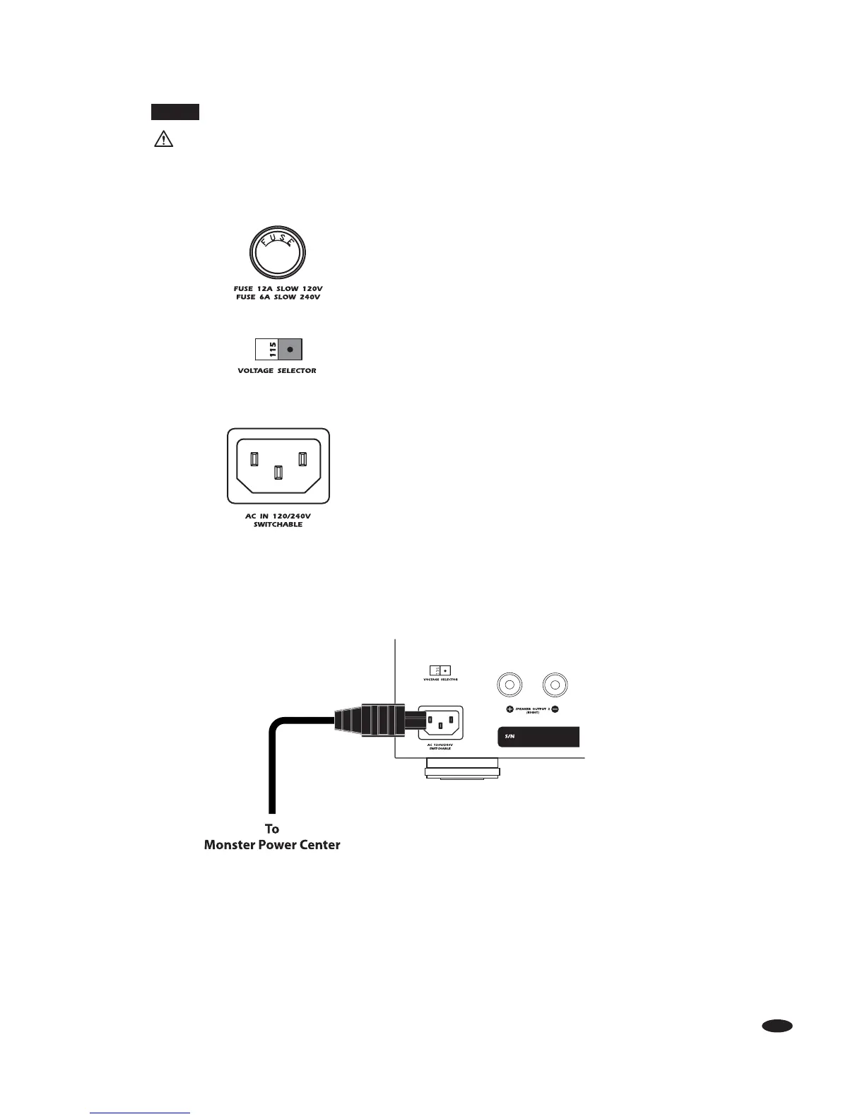 Monster amplifiers can be run at 115V or 230V. Verify that the voltage switch
