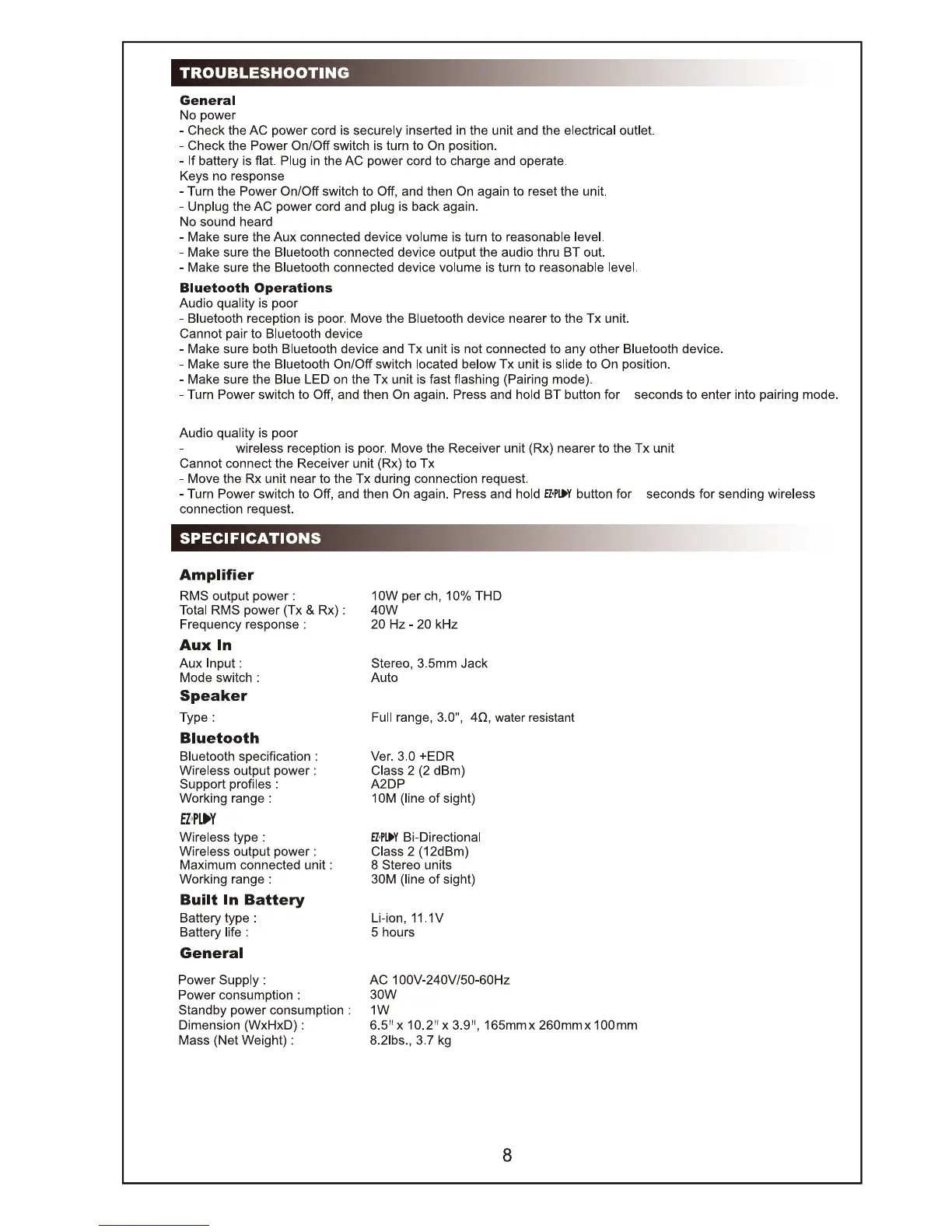 Monster BTW249 - Troubleshooting; General Issues; Bluetooth Operations Issues; EZ-Play Link Issues