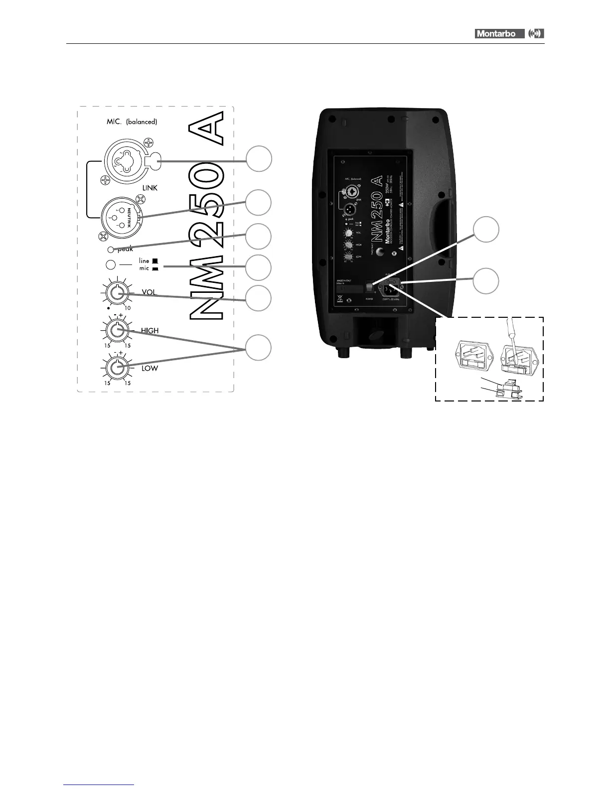 1 MIC: entrée symétrique, sélection pour micro (-40dBu / 2kOhms)