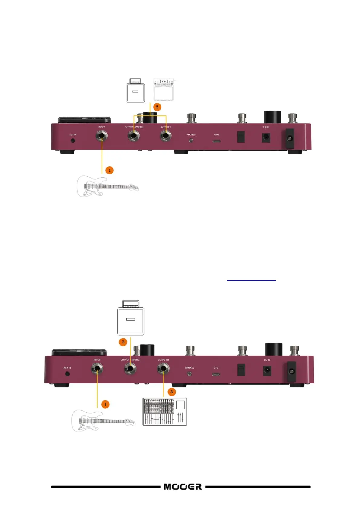 2. Connect to the RETURN jack of a guitar amplifier or to the input of a power amp.