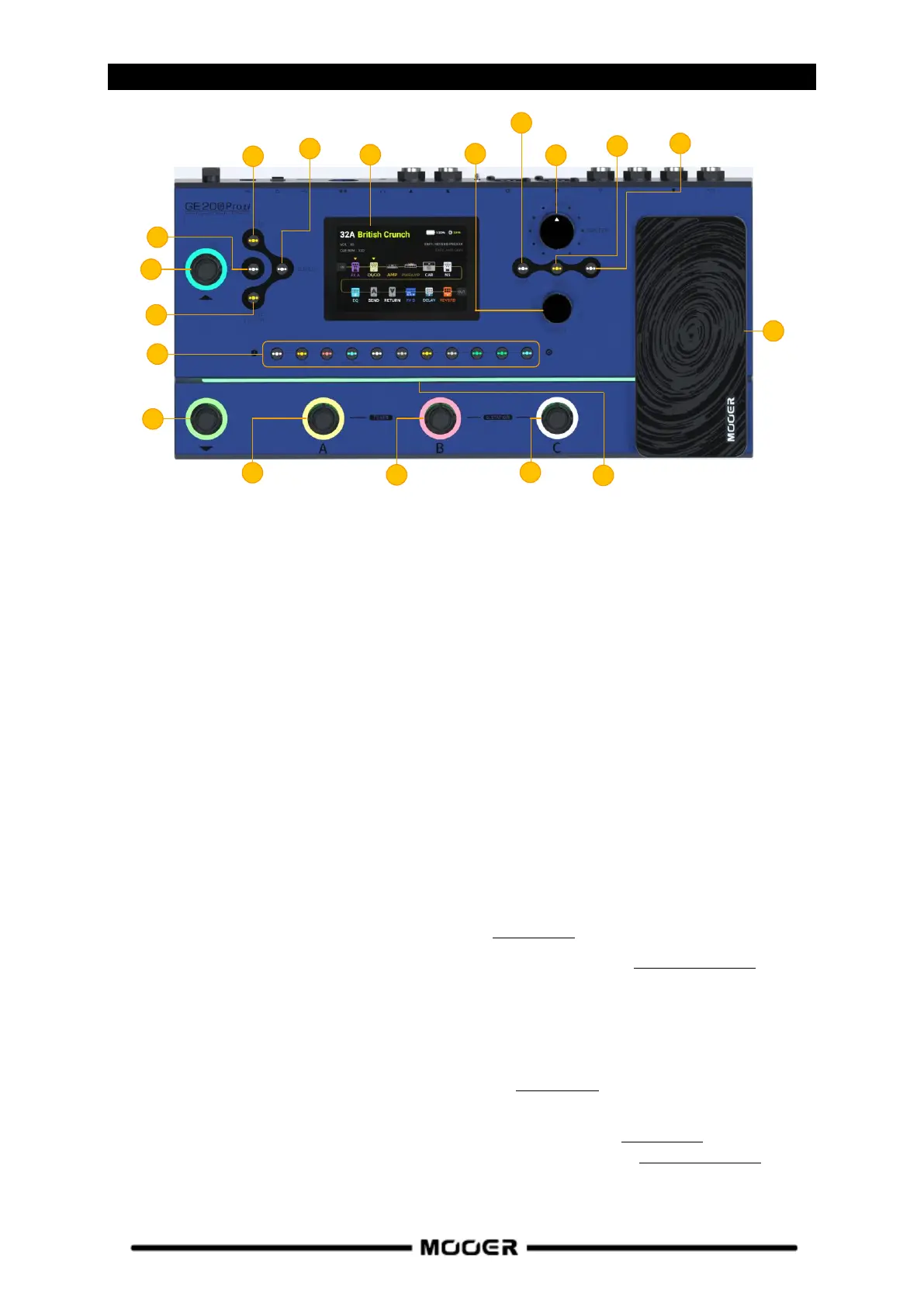11. Effect module LED buttons: The buttons correspond to the effect modules used in the effect
