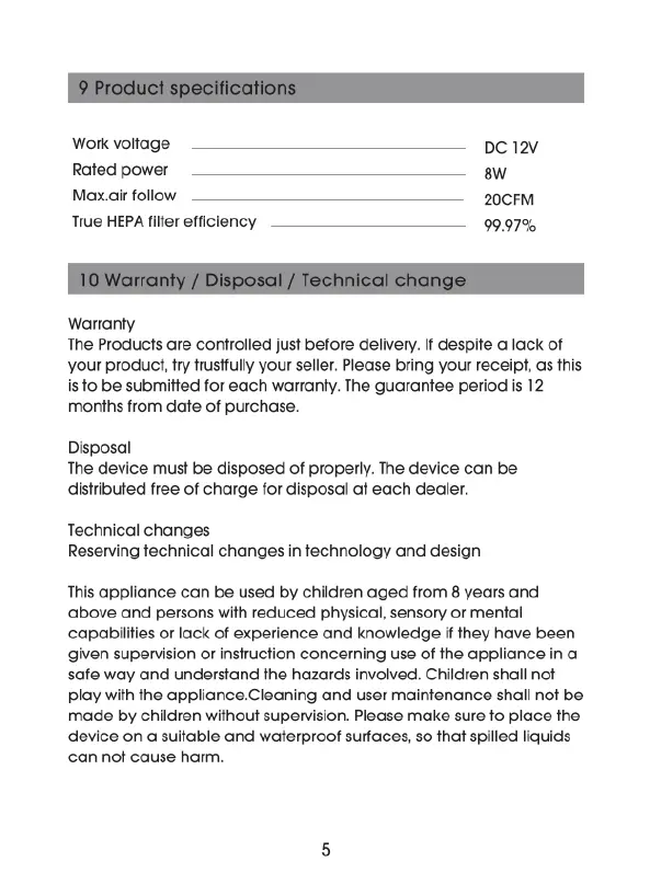 MOOKA EPI810 - Product Specifications; Warranty, Disposal, and Technical Changes; Warranty Information; Disposal Guidelines