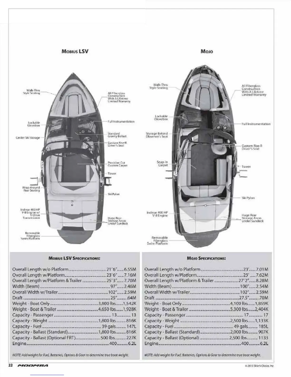 Moomba Outback V - Moomba Model Specifications; Mobius LSV Specifications; Mojo Specifications