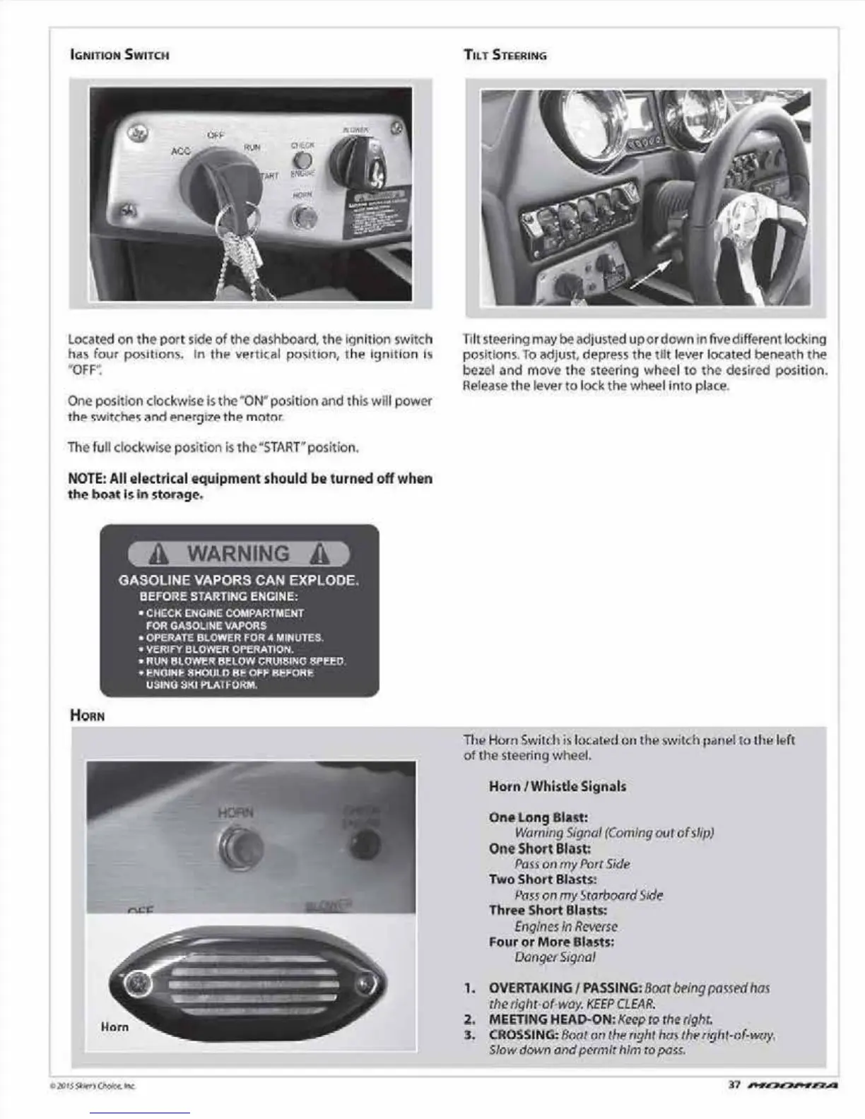 Moomba Outback V - Ignition, Steering, and Horn Controls; Ignition Switch and Tilt Steering Adjustment