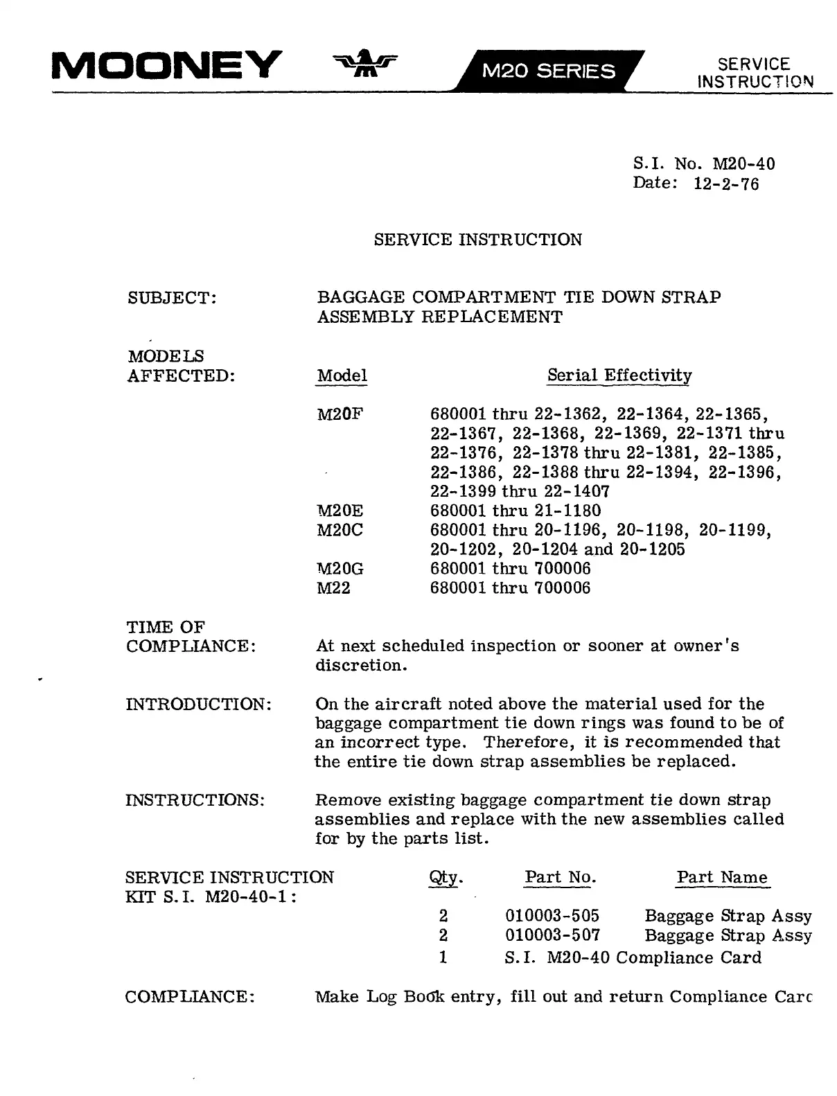 Mooney M20C - Baggage Compartment Tie Down Strap Replacement; Incorrect Material Identified; Replacement Procedure