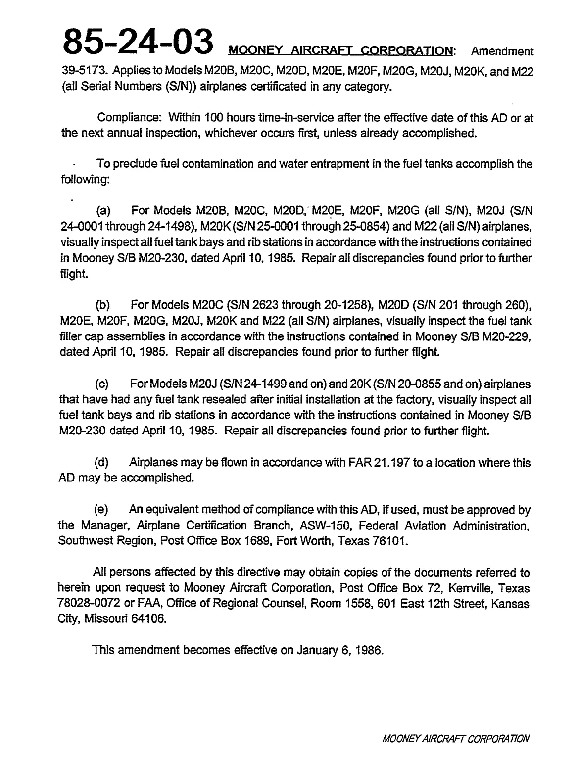 Mooney M20C - Airworthiness Directive 85-24-03; Fuel Contamination Prevention; Compliance and Repair